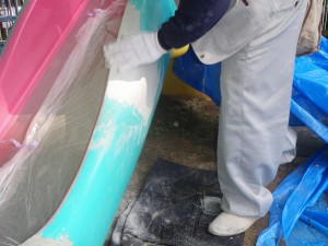 群馬県草津町の光泉幼稚園のFRPすべり台の破損個所を下記の工程により修繕しました。